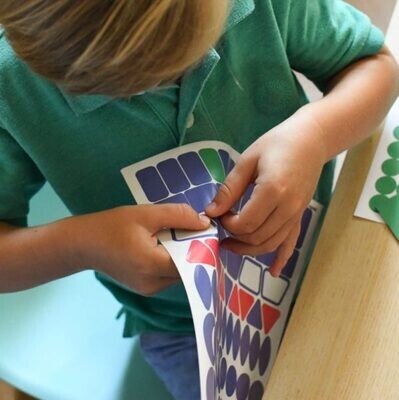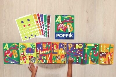 Chacune des 26 lettres de l'alphabet est illustrée par un animal : A comme Antilope, B comme Bison, C comme Crocodile... L'enfant déplie le panorama et colle les gommettes géométriques sur le grand décor en suivant les couleurs indiquées. Il fera ainsi apparaître les animaux et les lettres de l'alphabet. Une fois terminé, le grand poster en gommettes peut être accroché au mur pour décorer la chambre.