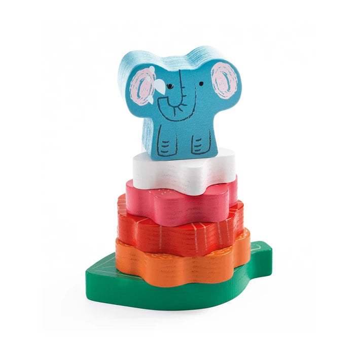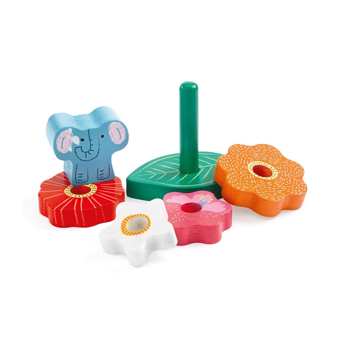 Puzz & Stack est un puzzle en bois facile à assembler et un jeu d'empilage. Les fleurs s'empilent sur l'axe en bois pour former une jolie pyramide de fleurs avec un petit éléphant sur le dessus.