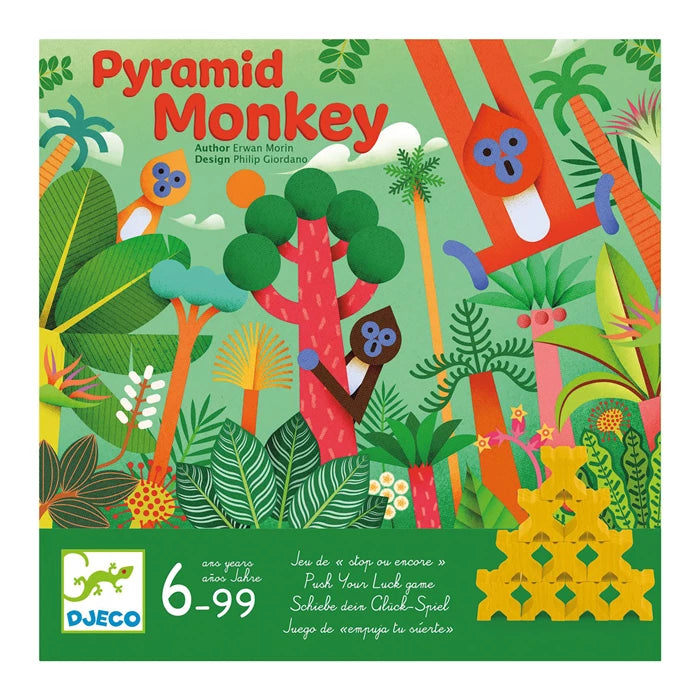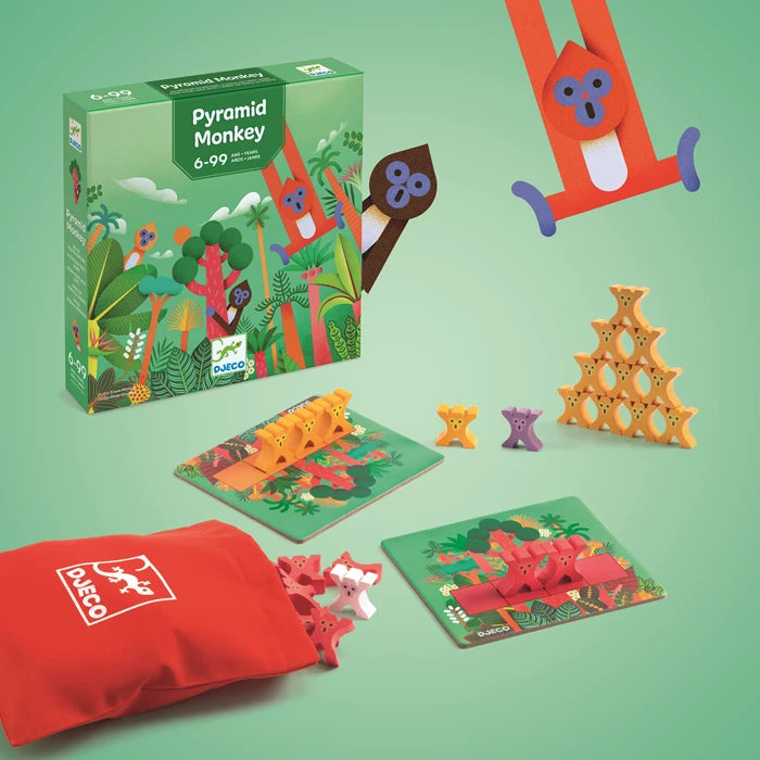 Dans Pyramid Monkey, des singes espiègles s'affrontent pour construire leur pyramide en premier. À chaque tour, les joueurs doivent prendre des risques en piochant des acrobates dans leur sac, mais attention aux acrobates blancs et violets qui peuvent mettre un terme à votre pyramide !