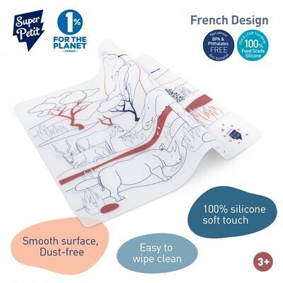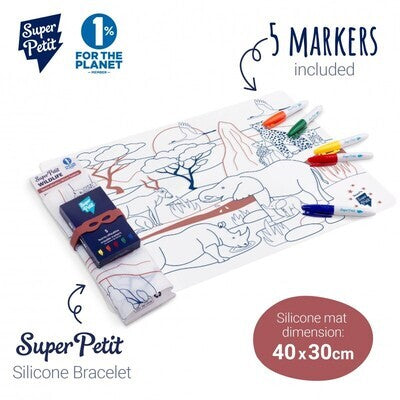 SuperPetit artiste : A découvrir absolument ce set ludique en silicone tout doux à colorier à l’infini avec ses 5 feutres lavables et aux encres non toxiques. On adore le dessin créatif et rigolo qui accompagnera votre enfant à table, avec des graphismes signés SuperPetit.