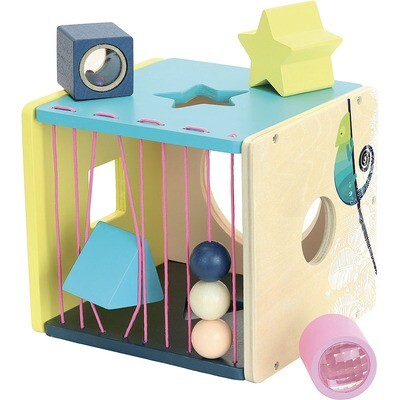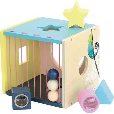 Des jolies pièces en bois à manipuler et à encastrer dans une boite aux couleurs naturelles et pétillantes, pour l’éveil sensoriel des tous-petits.