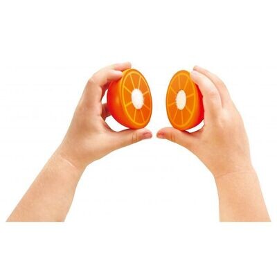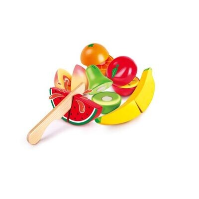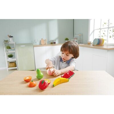 Ce set de fruits alléchant donne envie de manger des aliments sains. Grâce au couteau de jeu à lame arrondie, tu peux couper toi-même l'orange, la poire et tous les autres fruits.