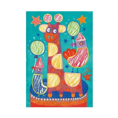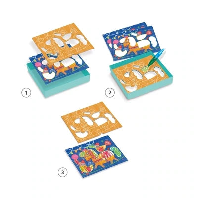12 images à colorier et 3 crayons qui marquent très bien. L'astuce: des pochoirs épais qui évitent de dépasser. On peut gribouiller autant qu'on veut, ce sera toujours réussi !