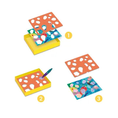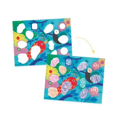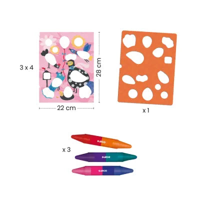 12 images à colorier et 3 crayons qui marquent très bien. L'astuce: des pochoirs épais qui évitent de dépasser. On peut gribouiller autant qu'on veut, ce sera toujours réussi !