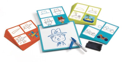 Comprend : 12 cartes recto-verso (15 x 15 cm), 1 planche effaçable et 1 feutre effaçable à sec. 1 chiffon.