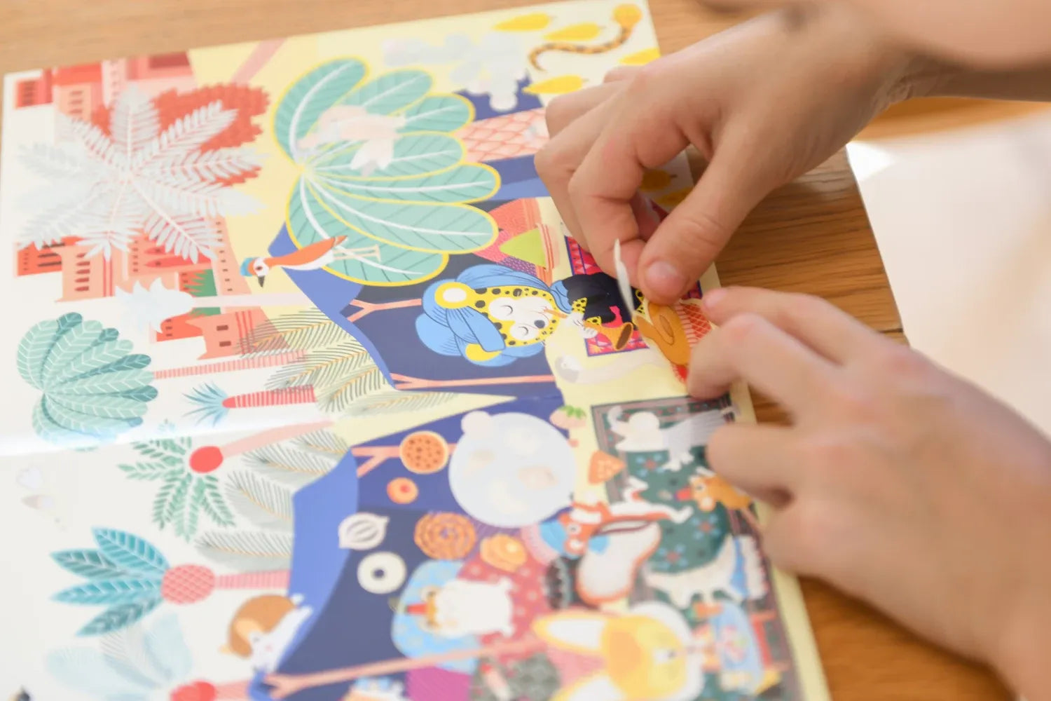Les tout-petits ont enfin leurs premières gommettes, faciles à attraper et à manipuler. Ils s’amuseront à composer 6 grandes images en collant les grosses gommettes sur le décor, ils découvriront ainsi les animaux de la savane, du jardin, de la banquise… Une activité qui ne tache pas, pour faire travailler ses dix doigts !
