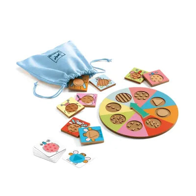 La boite de jeu contient une roue en bois gravée, 8 tuiles "Insecte" en bois gravé, 1 sac en tissu, 24 jetons "Récompense" en carte épaisse et la règle du jeu.