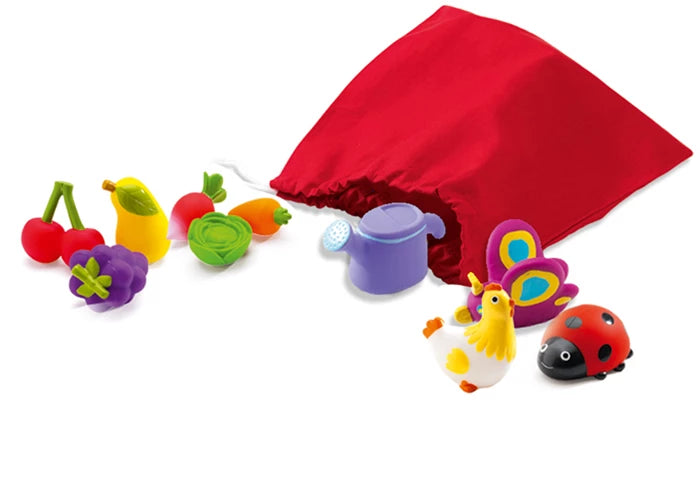 La roue indique quels éléments doivent être tirés du petit sac en tissu. Les enfants n'ont pas le droit de regarder dedans et ils doivent sentir où se trouvent les coccinelles, les cerises etc. Ils apprennent en même temps les noms d'objets du quotidien et à respecter des règles.