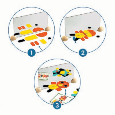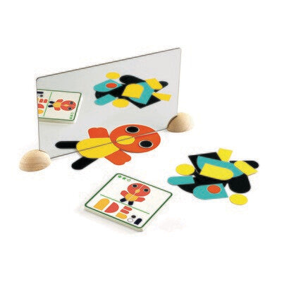 Contient : 1 miroir en plastique, 20 cartes "modèles" et 2 x 18 formes en papier